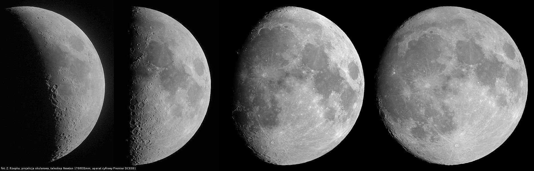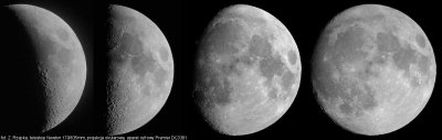 Przedstawiany mini cykl przebiegu faz Księżyca od nowiu do pełni jest dydaktycznym przykładem, że nawet skromne wyposażenie do obserwacji nieba (średniej wielkości teleskop Newtona 170/835mm oraz cyfrowy aparat kompaktowy Premier DC3381 z matrycą 3 mln. pikseli), pozwala na wykonanie całkiem udanych zdjęć Księżyca. Warunkiem jest tu tylko posiadanie wystarczająco sztywnego połączenia okularu teleskopu z aparatem kompaktowym, przy czym okular teleskopu winien mieć średnicę soczewki ocznej znacząco większą od przedniej soczewki obiektywu aparatu. Prezentowane zdjęcia wykonane zostały w projekcji okularowej, przy użyciu własnej konstrukcji mocowania szynowego oraz okularów typu Plossl 20mm Antaresa oraz 25mm Siriusa Oriona. Ostrość obrazu Księżyca ustalana była przy użyciu lupki na 1.5" ekraniku LCD aparatu cyfrowego. Wszystkie zdjęcia wykonano korzystając z 2-sekundowego samowyzwalacza aparatu, co było wystarczające do skutecznego wytłumienia drgań teleskopu po uruchomieniu spustu migawki na korpusie aparatu. Zdjęcia wykonano przy maksymalnej rozdzielczości matrycy CCD tj. 3.0 mln pikseli (2032x1520 pikseli), automatyce ustawienia ostrości i naświetlania ale także manualnej korekcji ekspozycji (najczęściej od -0.5 EV do - 2.0 EV) oraz różnych długościach ogniskowej obiektywowego zooma aparatu cyfrowego. Na zdjęciach orientacja terminatora względem dłuższego boku kadru była ustawiona w przybliżeniu, zaś pólnocna półkula Księżyca jest u góry, południowa u dołu - tak jak widzimy Księżyc gołym okiem lub przez lornetę pryzmatyczną. Każde z zamieszczonych zdjęć, to nie efekt "składanki" ("stackowania") wielu klatek lecz pojedyncze ujęcie, tyle, że wybrane najlepsze z wykonanej całej ich serii. Więcej zdjęć i informacji dostępnych jest na stronie autora.